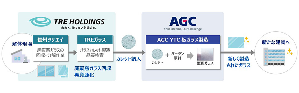 諏訪及び周辺地域で信州タケエイが解体を行った現場で発生した廃棄窓ガラスを同社が回収・分解し、同じくTREグループのTREガラス株式会社(以下「TREガラス」)がガラス部分をカレットに加工する工程を担当しました。その後、AGCがこのカレットを用いて新しい板ガラスを製造するプロセスの検証を行いました。