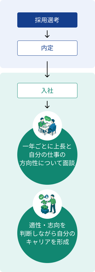 入社後の流れからキャリアを築くための人材育成制度や資格取得支援制度などに加え、福利厚生をご紹介します。