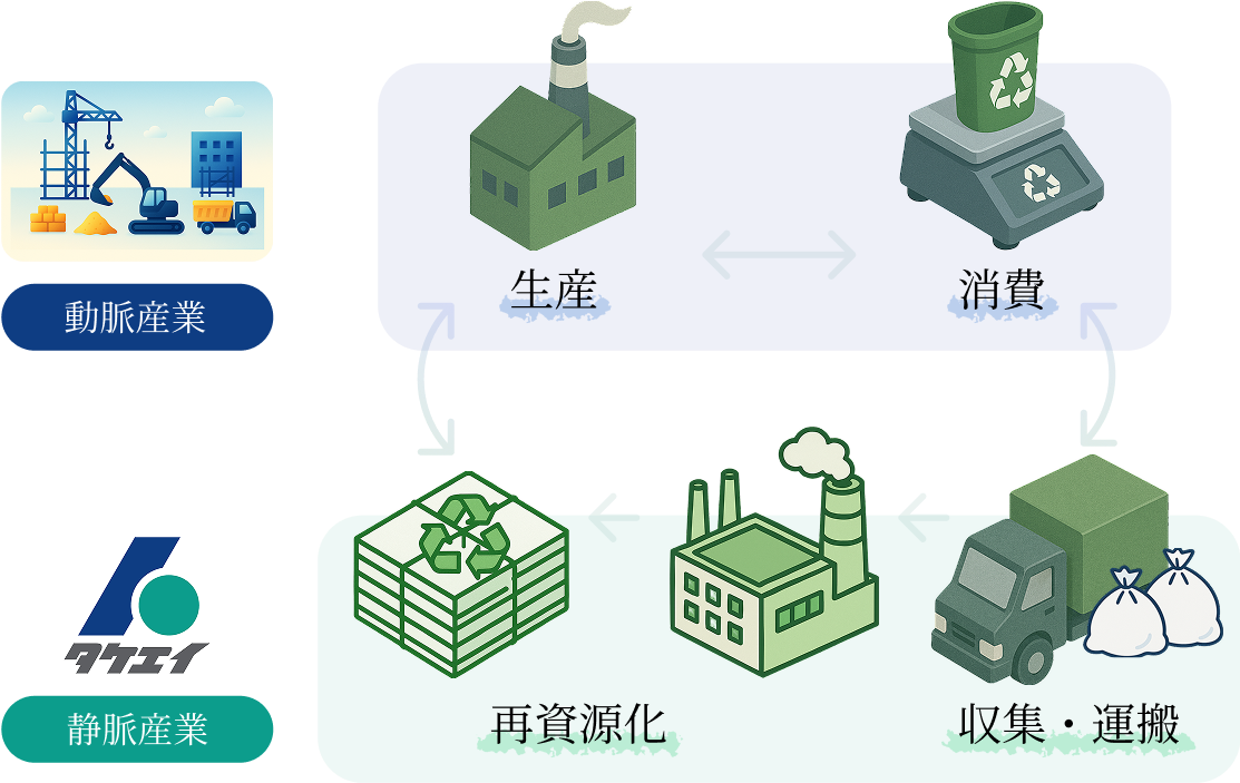 資源を使って製品をつくり社会に供給する「動脈産業」、 捨てられた廃棄物を再資源化する「静脈産業」。
